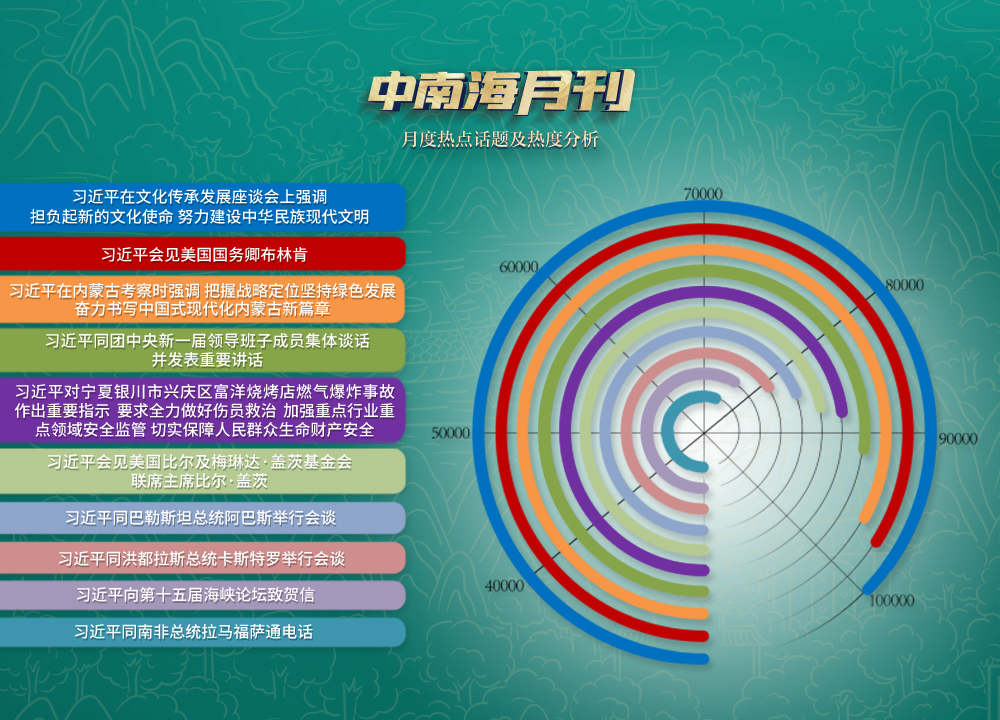 在央视网“智闻”系统提取分析的6月全网时政新闻热点中,处处体现着“以古人之规矩,开自己之生面”的生动实践。 6月19日下午,习近平主席在会见美国国务卿布林肯时强调:“世界需要总体稳定的中美关系,中美两国能否正确相处事关人类前途命运。宽广的地球完全容得下中美各自发展、共同繁荣。” 在同布林肯会见的福建厅内,巨幅画作《武夷之春》映入眼帘。习近平总书记曾在武夷山九曲溪畔的朱熹园,深刻阐释中华五千年文明和中国特色社会主义道路之间的关系。此时此情此景同样给人以无尽启示。 从“和而不同”的处世原则,到“共享大同”的社会理想,和平、和合、和睦、和谐始终是深深植根于中华民族的价值追求。