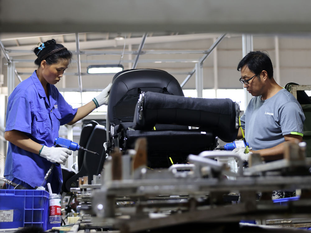 8月19日,工人在位于河北省涿州市的麦格纳宏立汽车系统(河北)有限公司生产车间工作。