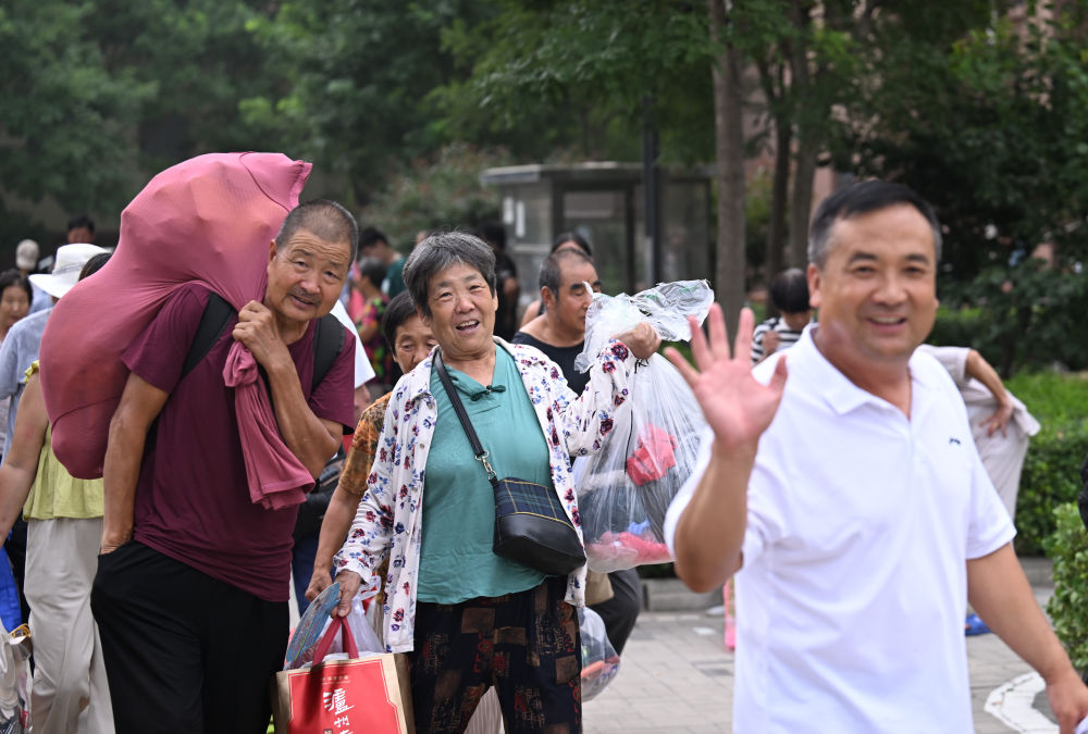 8月20日,在天津市西青区赤龙南街道一临时安置点,村民收拾行李准备回家。当日,天津市静海区东淀蓄滞洪区37000余名转移安置人员全部返回台头镇、独流镇、王口镇等地。