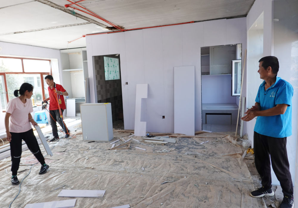 9月7日,黑龙江省尚志市老街基乡龙王庙村村民包喜文(右)查看受损房屋的装修进度。
