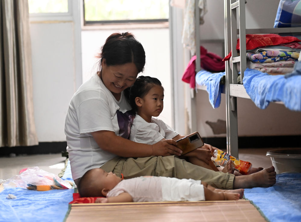 8月12日,在天津市静海区大邱庄中学集中安置点,转移群众在宿舍内照看孩子。