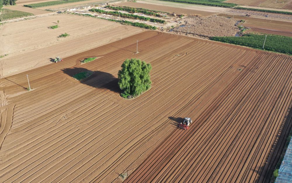 8月18日,在河北省涿州市刁窝镇潘各庄村,农民驾驶农业机械进行复耕补种作业(无人机照片)。
