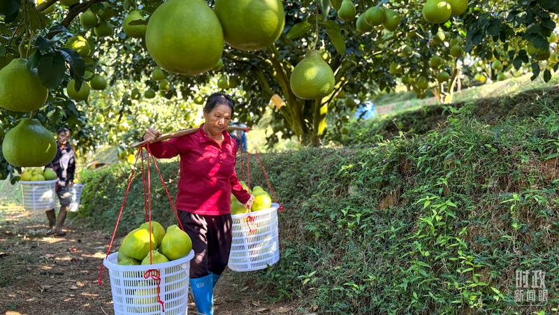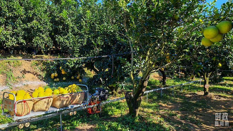 △金柚采摘运送用上了无人轨道车,可大大减轻人力负担。(总台央视记者郭鸿拍摄) 如今,梅县区金柚种植面积近28万亩,柚农5万多户,依托金柚产业人均年收入1万多元,占农业人口人均年收入的40%。金柚已成为梅县农民的“摇钱树”“致富果”。