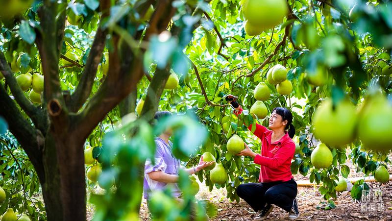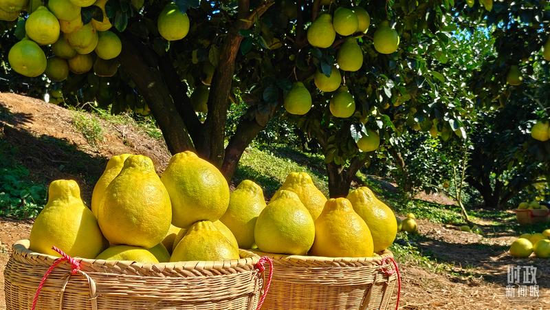 △南福金柚种植基地,柚林迎来丰收。(总台记者吴媚苗、总台央视记者鄂介甫拍摄) 梅州是中国金柚之乡,“梅县金柚”2021年获国家地理标志农产品保护认证,其种植历史已有100多年。