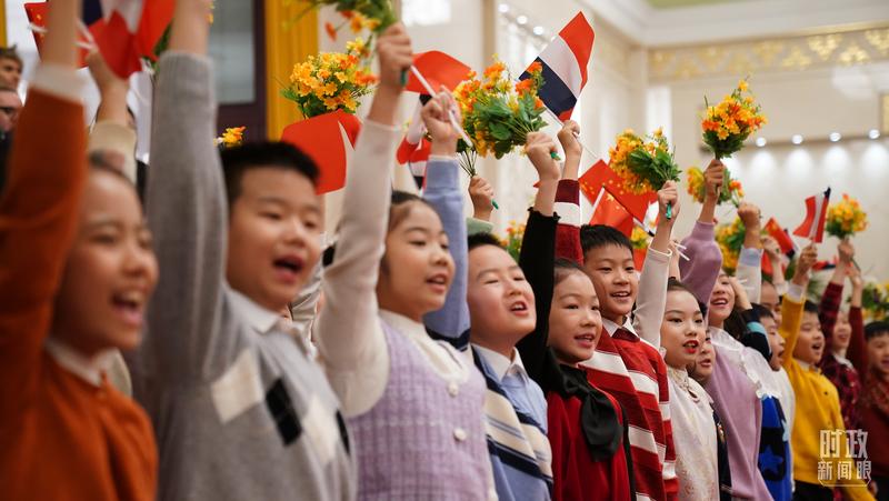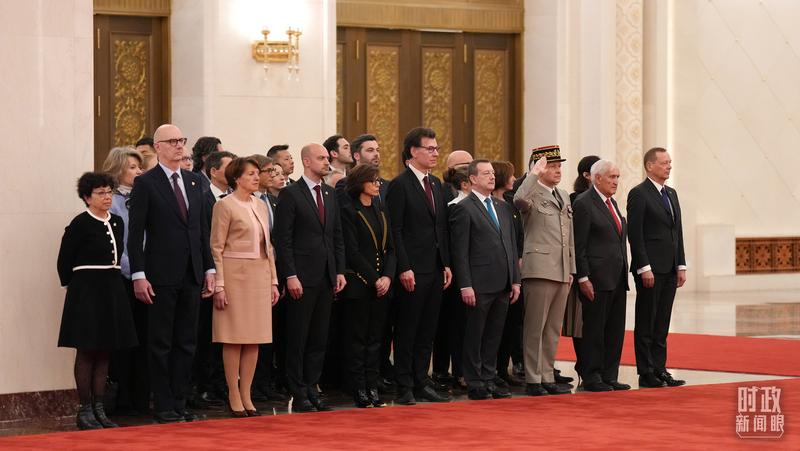 △欢迎仪式上的礼兵和少年儿童。(总台记者李晋拍摄) 一是热情、高规格。 红毯铺就、礼兵列队、礼炮鸣响,笑容灿烂的少年儿童挥动花束,一场大国迎宾礼让初冬的人民大会堂暖意融融。 习主席和马克龙总统先后举行小范围、大范围会谈,共同见证签署合作文件、会见中外记者,并在中法企业家委员会第七次会议闭幕式上致辞。 紧密的日程安排,体现出中法双向奔赴、加强合作的共同意愿。 与中方高规格礼遇相对应的,是法方代表团的强阵容。据悉,马克龙总统此行代表团,由包括6位部长在内的政府成员、文化和教育界人士以及企业家等约200人组成。